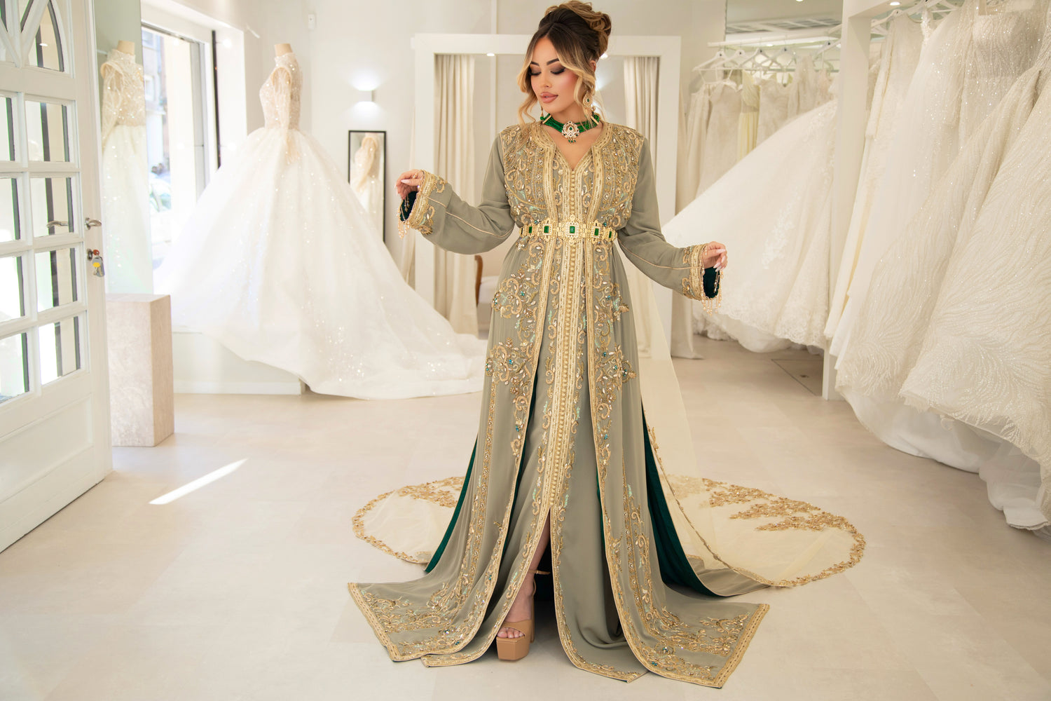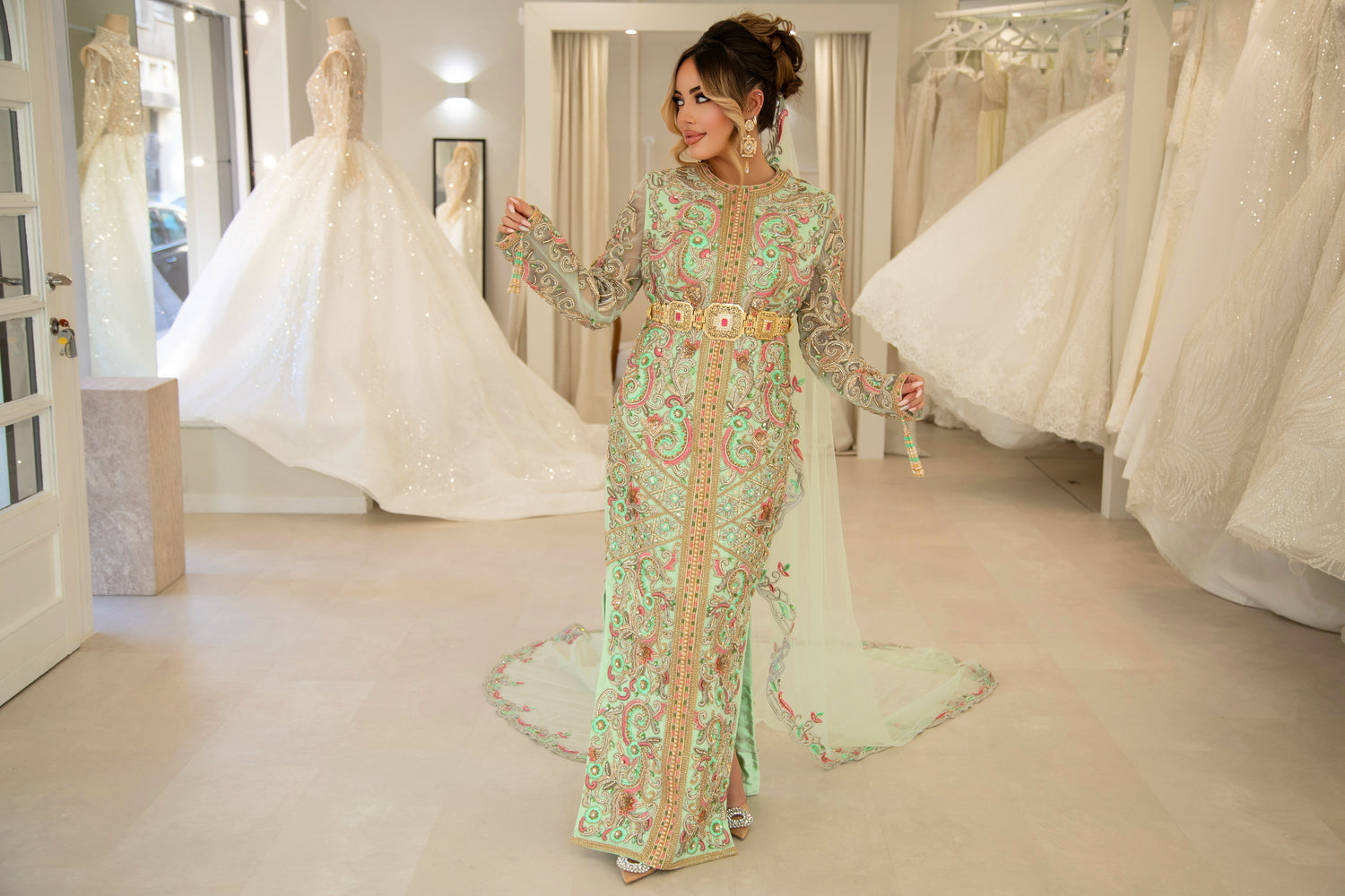 Ce chef-d'œuvre vestimentaire brille par son tissu vert pastel délicat, agrémenté de broderies dorées méticuleusement ouvragées et ponctué d'éclats de strass et de perles. La ceinture structurée vient souligner la taille, apportant ainsi une définition sophistiquée à la silhouette. Le voile fluide apporte une touche de splendeur, faisant de 'La Sofia' le choix parfait pour votre mariage.