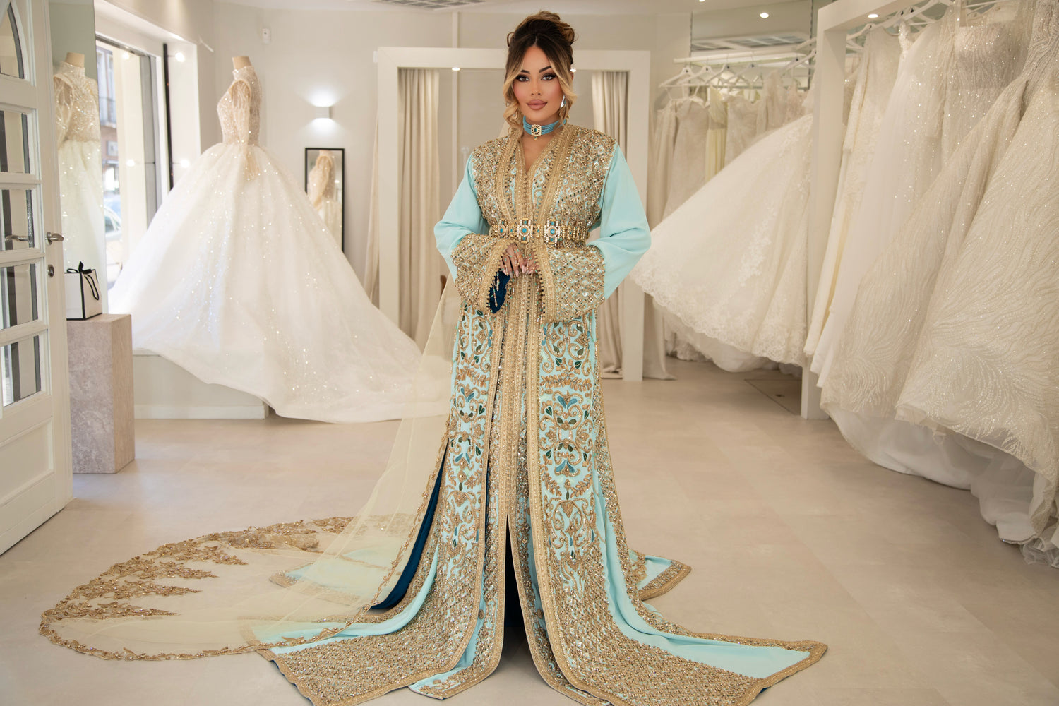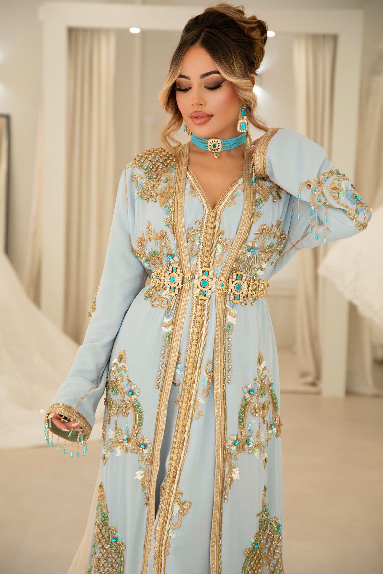 Découvrez l'élégance intemporelle avec notre Caftan Bleu Ciel 'Azure Élégance', une pièce maîtresse de raffinement et de sophistication. Sa teinte apaisante est sublimée par des ornements dorés et des pierres turquoise, évoquant la richesse des palais orientaux. La ceinture structurée met en valeur la silhouette, tandis que le voile transparent ajoute une touche de noblesse. Ce caftan est un hommage à la beauté orientale.