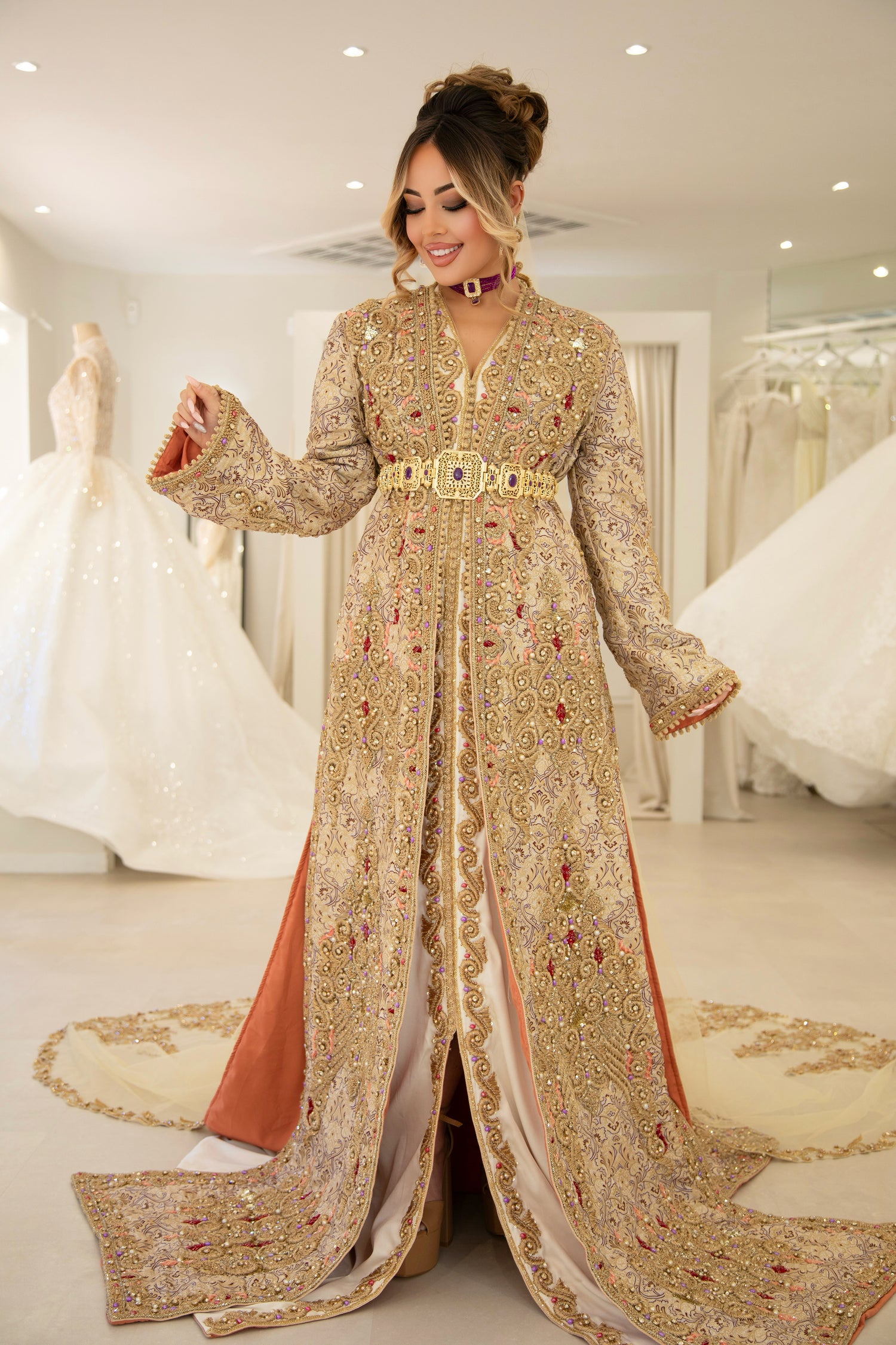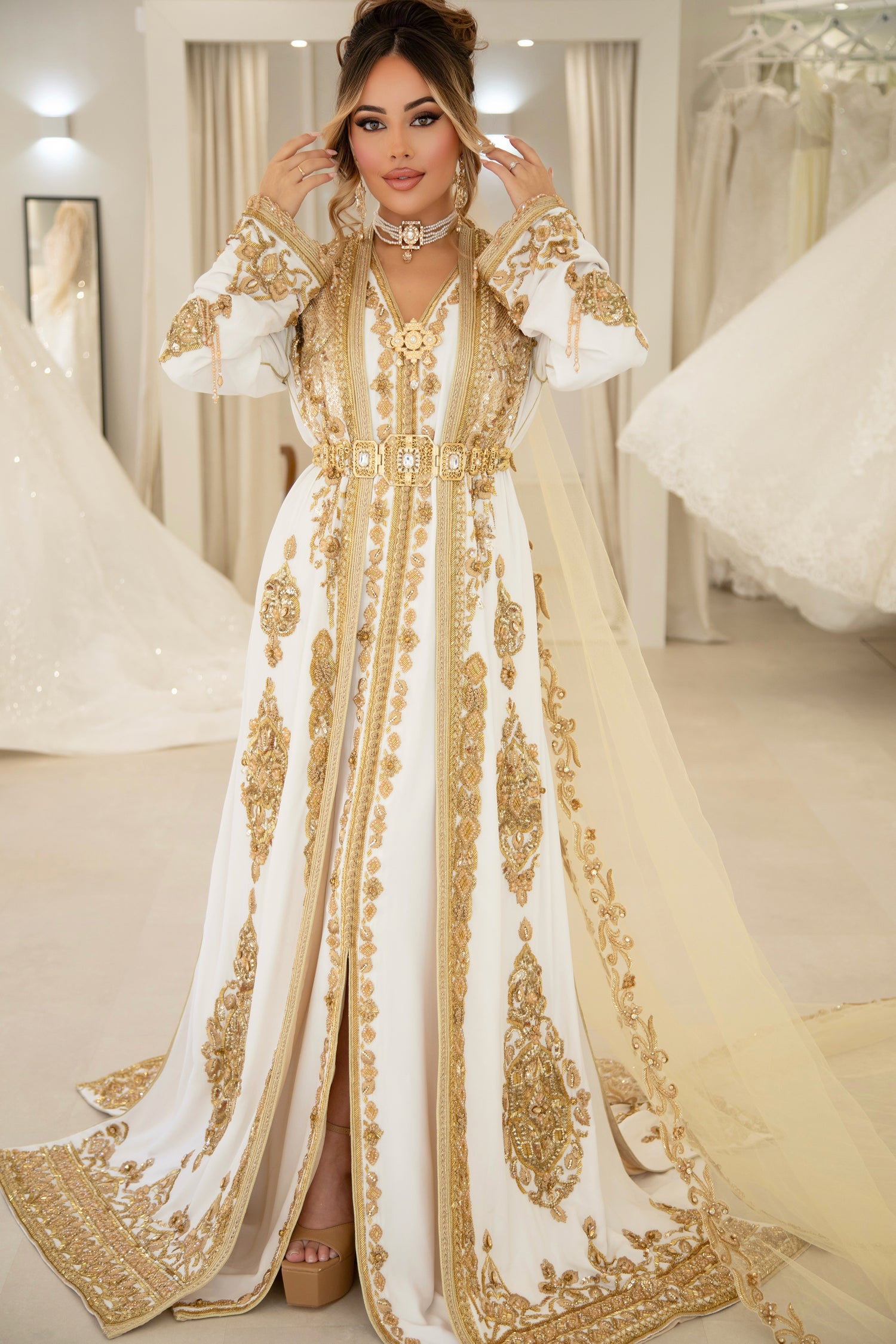 Laissez-vous séduire par le luxe intemporel de notre Karakou Dorée Majestueux, un chef-d'œuvre moderne conçu pour sublimer vos moments les plus précieux. Les broderies dorées et les strass éclatants s'unissent pour créer une œuvre d'art, où chaque détail scintille. La ceinture bijou cintrée et la traine somptueuse complètent cette silhouette audacieuse, faisant de cette robe une icône de l'élégance contemporaine pour les occasions les plus nobles