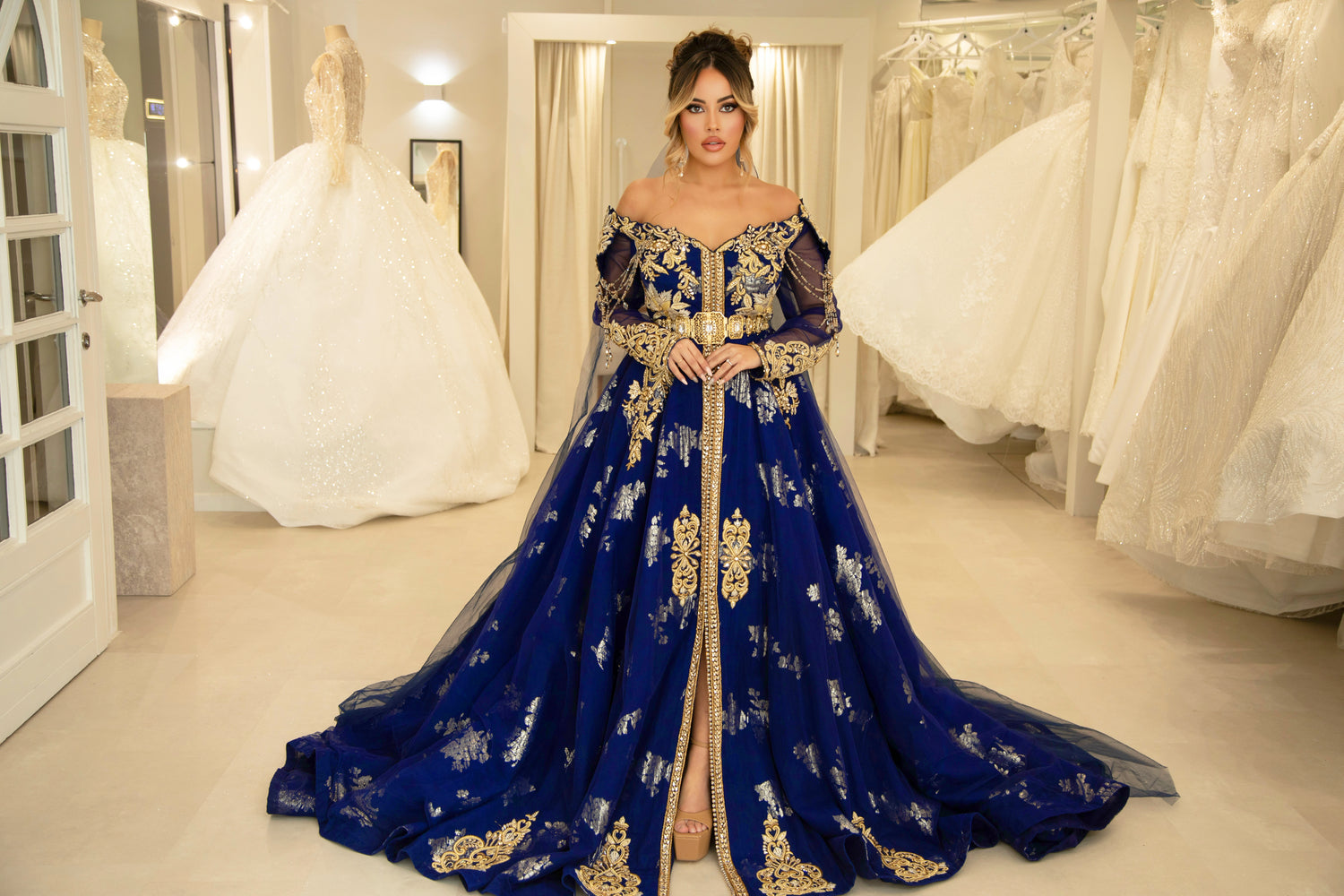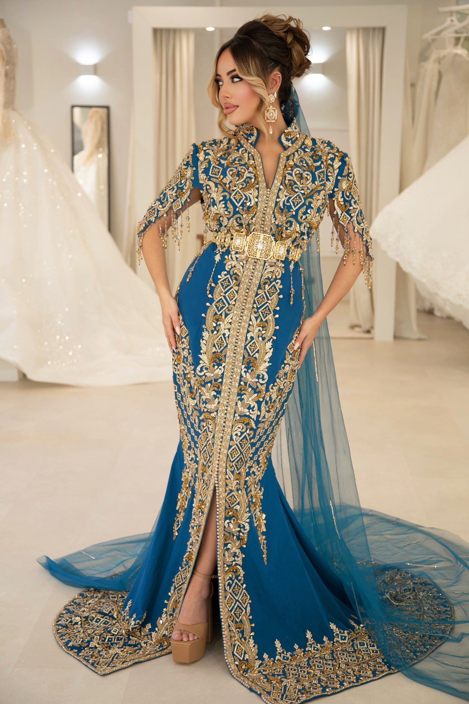 La Robe Bleue Royal, définie par son audacieuse broderie dorée, est une pièce maîtresse qui allie modernité et tradition. Avec son tissu riche en couleurs et orné de strass scintillants, cette robe est conçue pour les femmes qui souhaitent un style à la fois royal et contemporain. La ceinture élégante met en valeur la taille, ajoutant une touche d'élégance indéniable à cette création sophistiquée