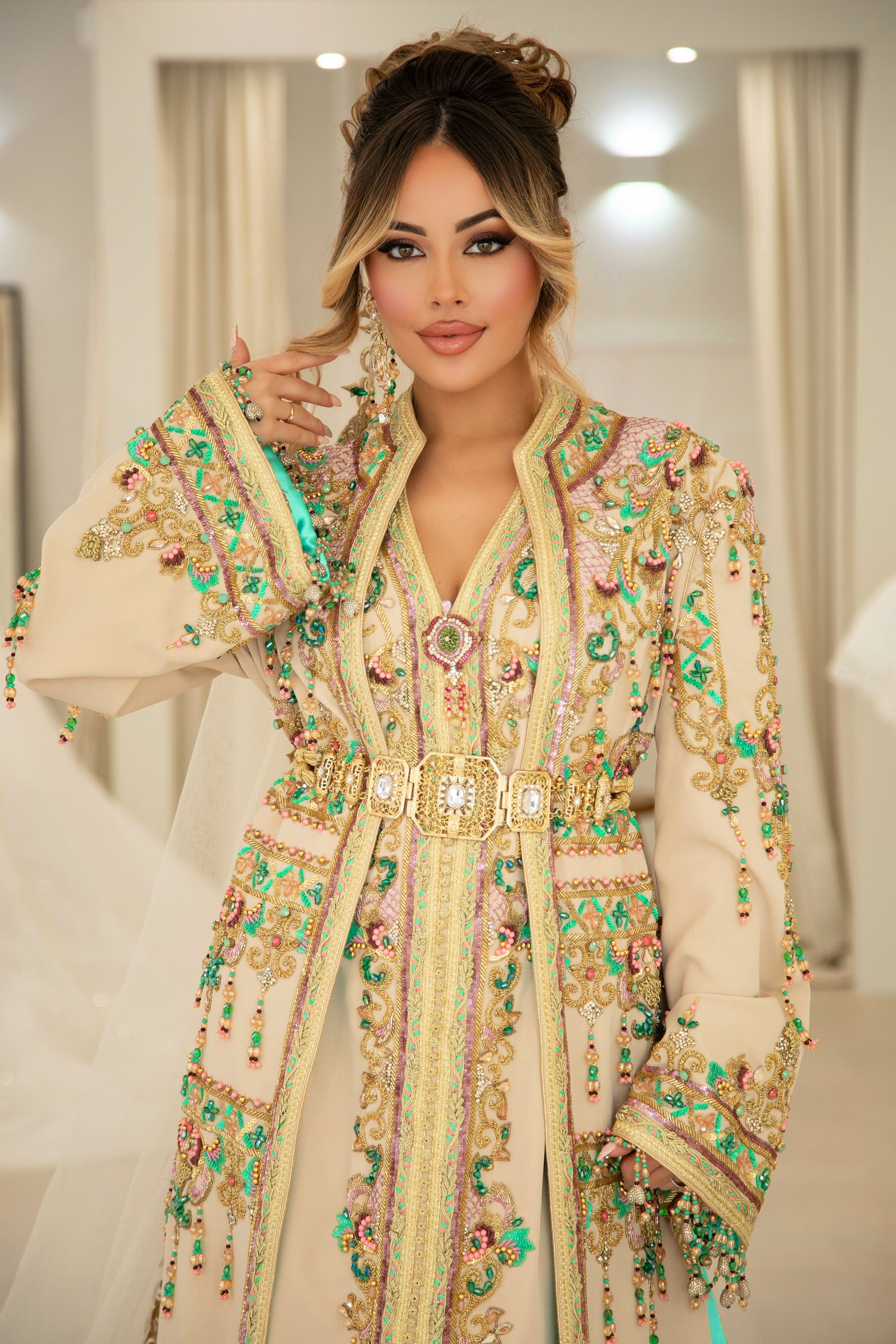 Incarnez l'élégance avec notre Caftan Nude, une pièce d'exception qui célèbre la modernité avec des broderies multicolores et des perles fines. La ceinture structurée et le voile délicat ajoutent une dimension de grâce et de féminité. Ce caftan, idéal pour les célébrations fastueuses, est une œuvre d'art à porter, offrant une allure à la fois moderne et intemporelle.
