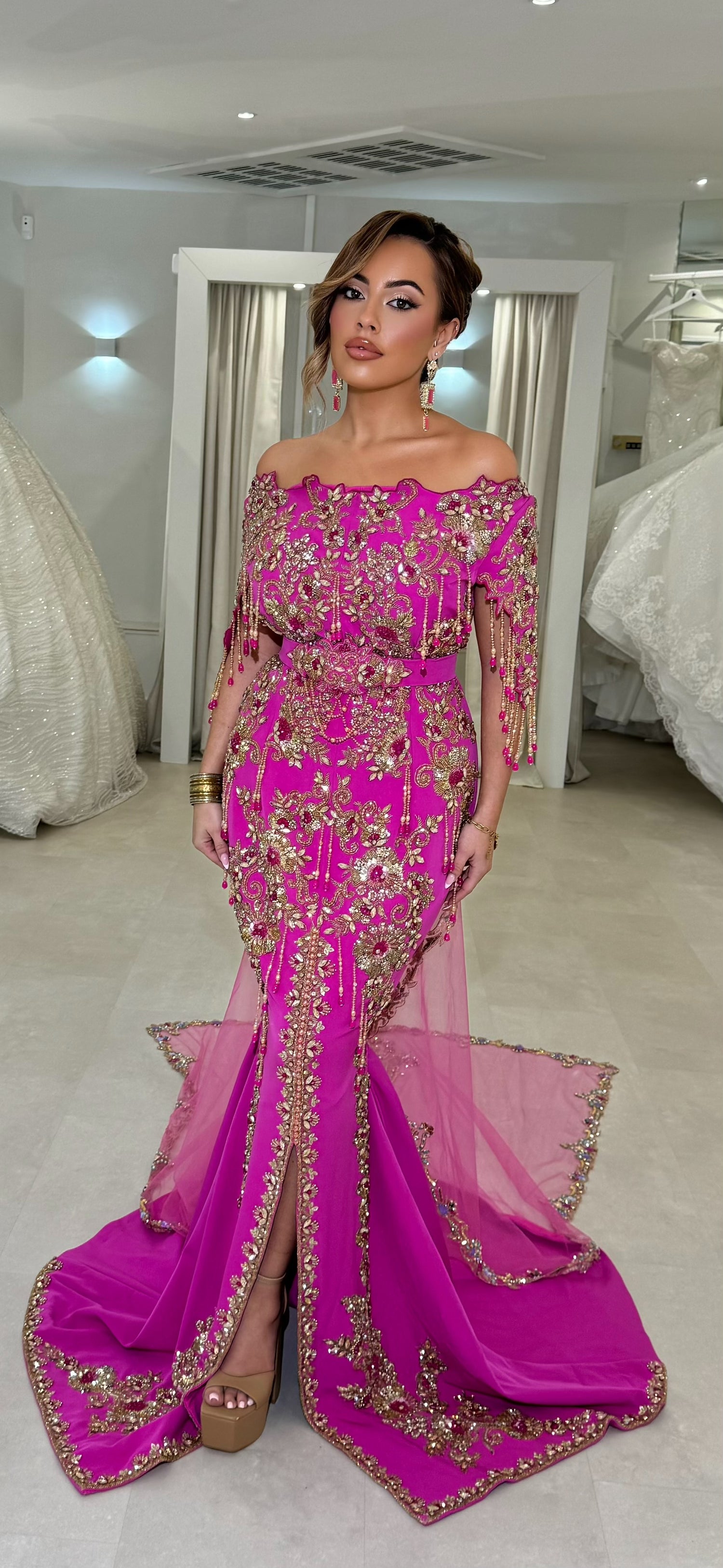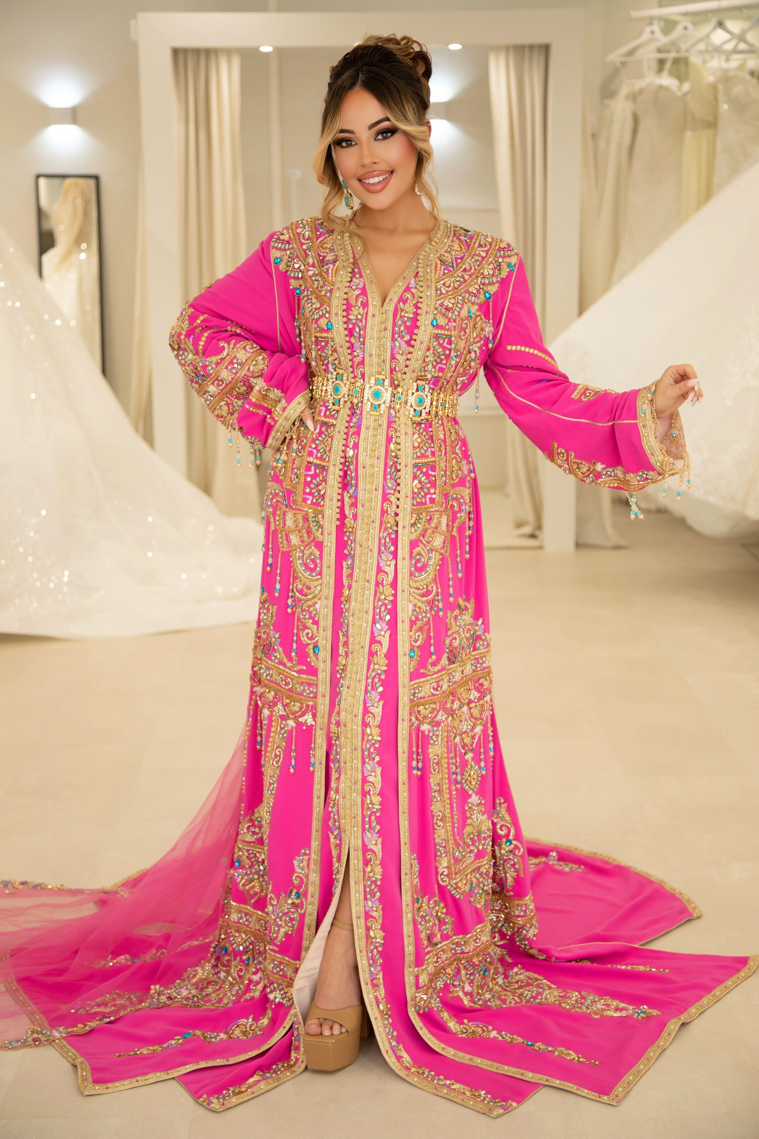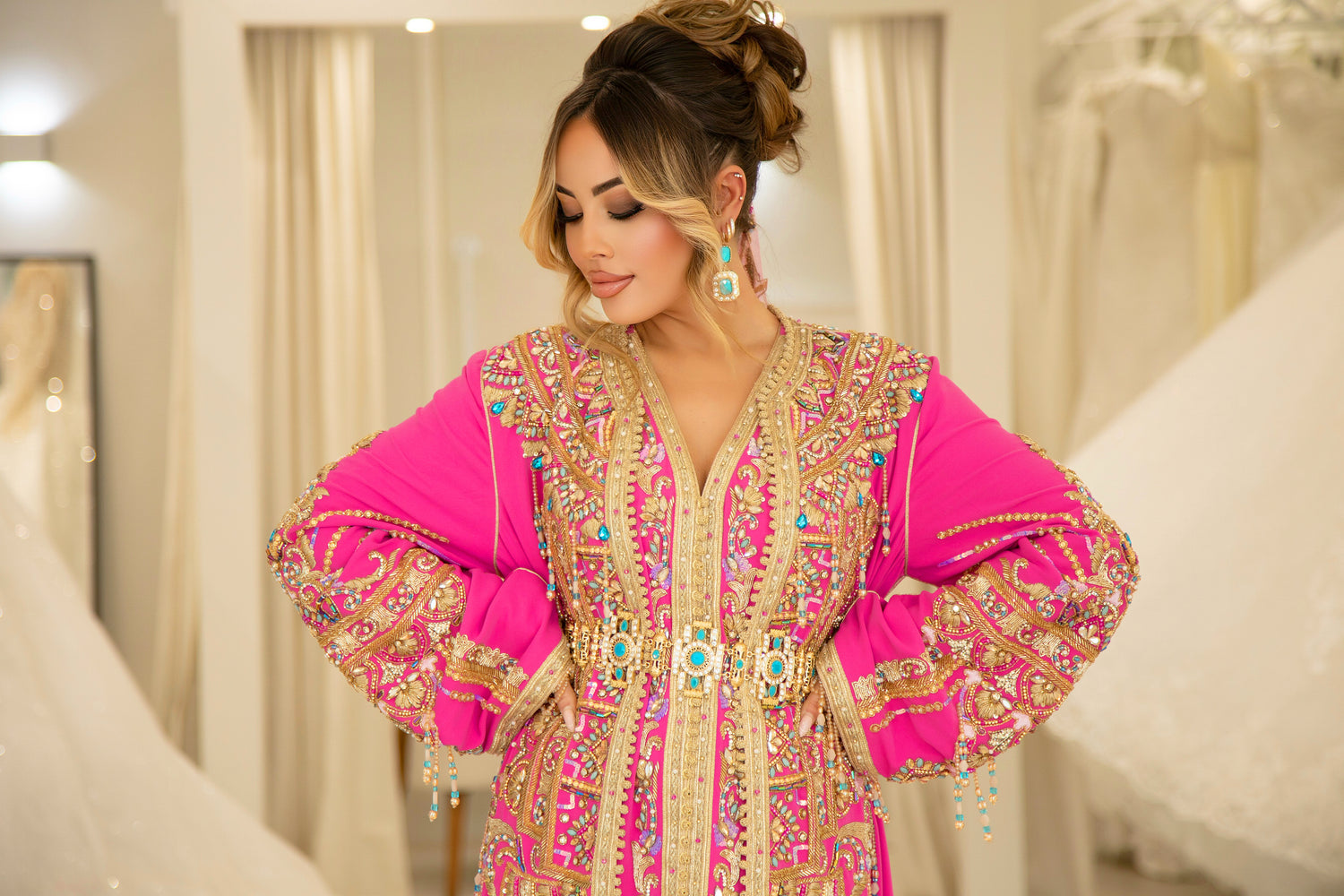 Apportez une touche de glamour à votre mariage avec cette robe caftan fuchsia ornée de broderies et de pierres scintillantes. Idéale pour une mariée à la recherche d’une tenue qui allie élégance et modernité, cette robe vous garantit une allure éblouissante pour les grands moments de votre cérémonie.