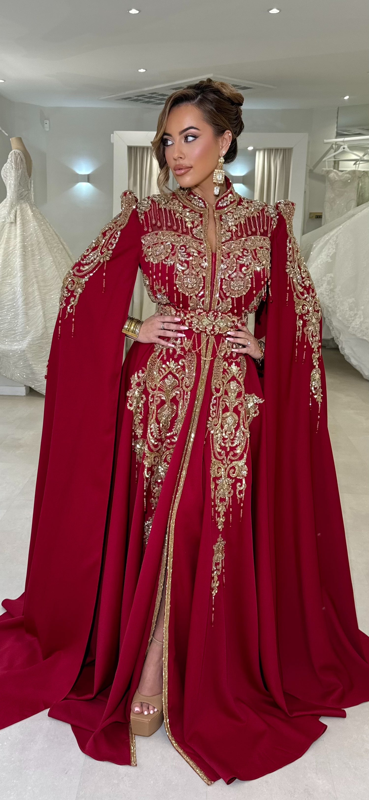 Sublimez votre mariage avec une pièce de maître : ce somptueux caftan rouge orné de broderies dorées raffinées et d’une cape majestueuse. Cette tenue, spécialement conçue pour une prestation Negafa de prestige, vous enveloppe de grâce et de distinction, parfaite pour une mariée recherchant l’élégance authentique et le luxe.