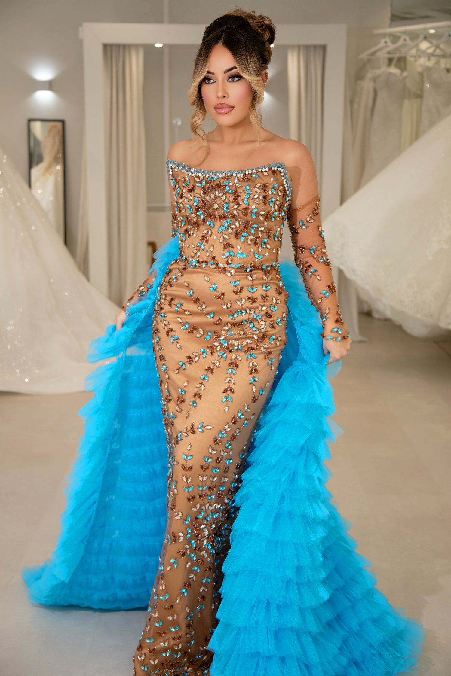 Découvrez l'Azurya une robe qui marie grandeur et brillance. Cet éblouissant chef-d'œuvre s'impose par son audacieuse palette de bleu azur et caramel, enrichie de cristal et de perles chatoyantes qui dessinent des motifs captivants sur le tissu translucide. La traîne volumineuse en cascades de tulle promet une prestance qui ne manquera pas de capturer les regards lors de votre mariage.