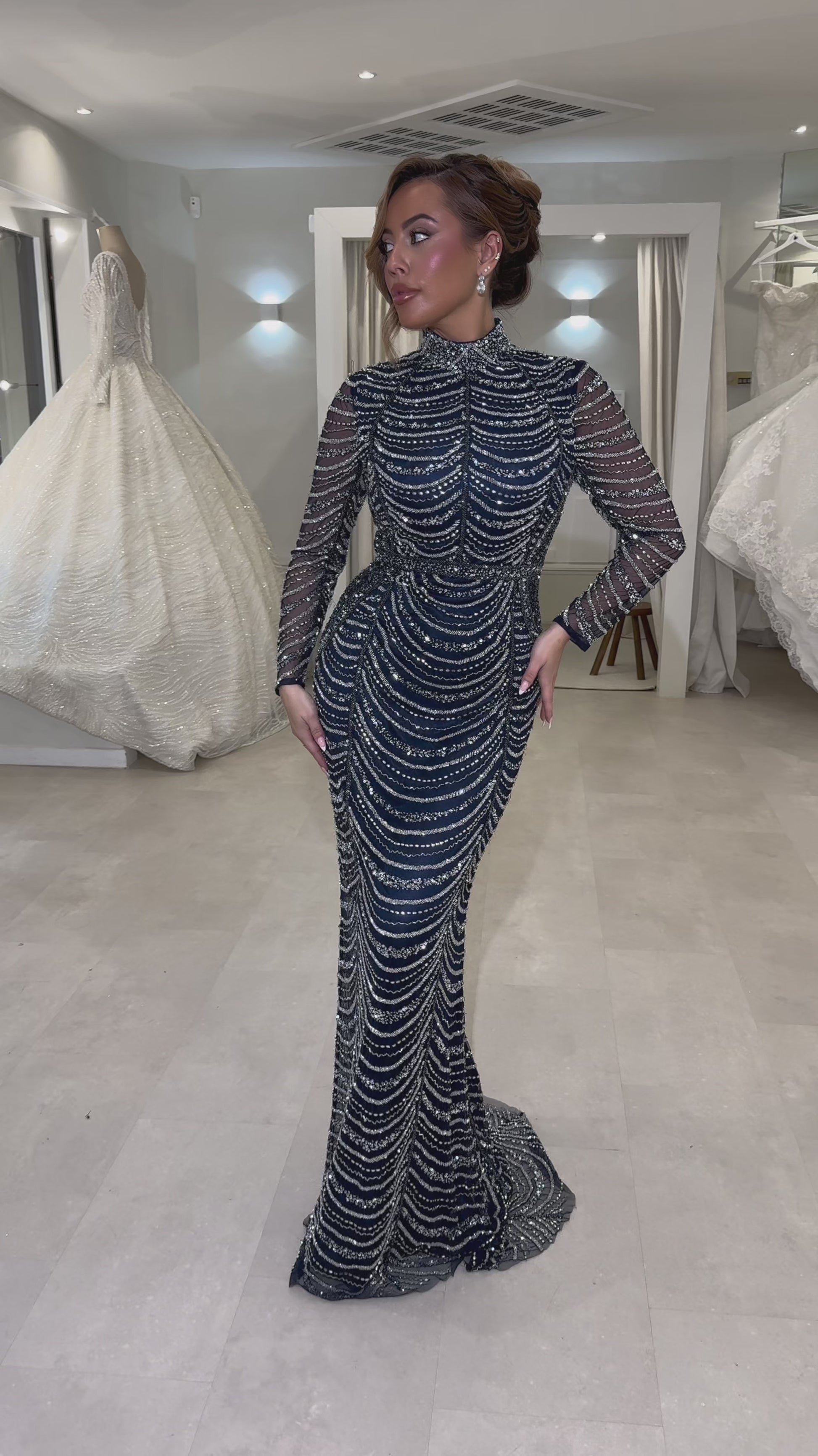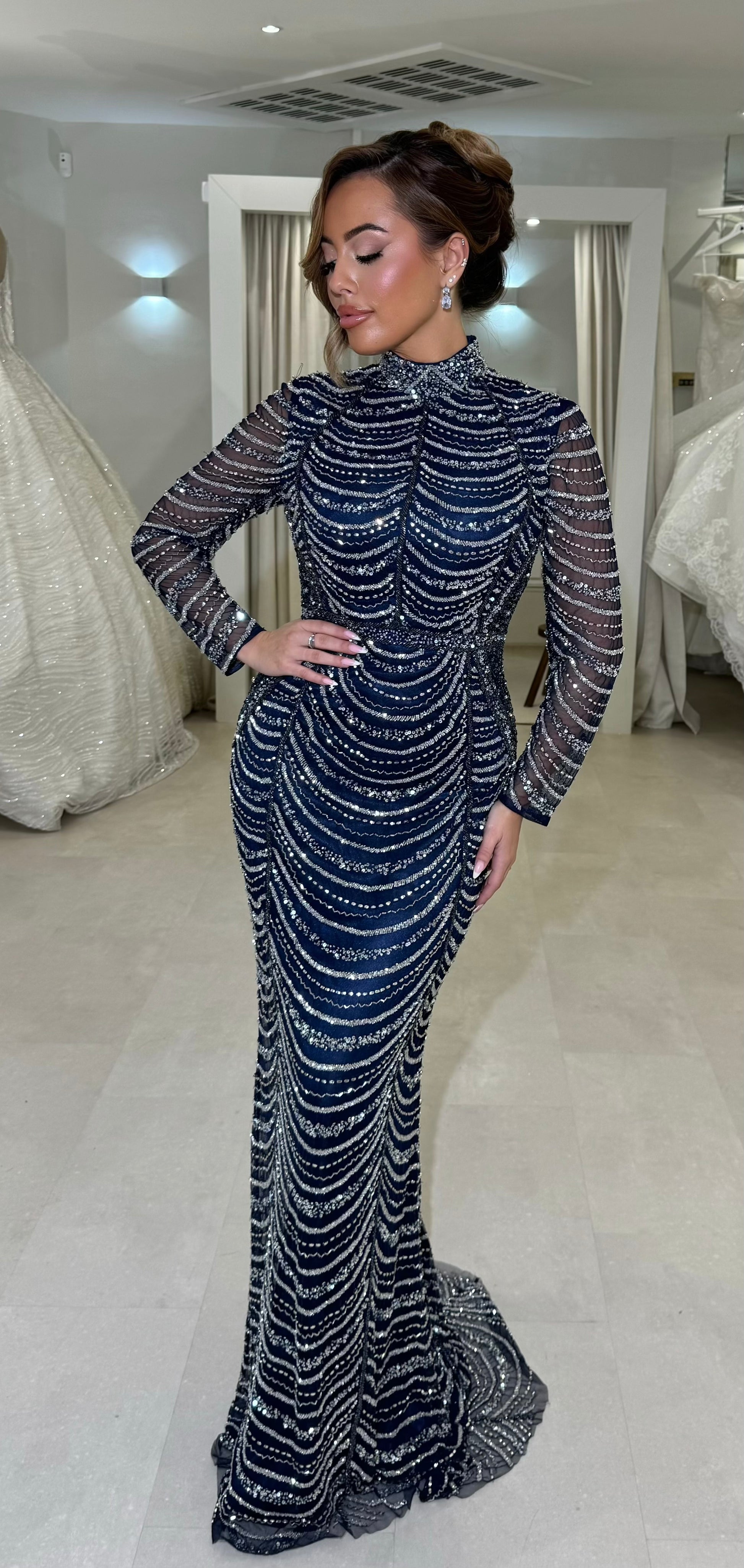 Cette somptueuse robe de soirée bleu marine, ornée de pierres argentées étincelantes, est un véritable chef-d’œuvre de raffinement et d’élégance. Chaque ligne de pierres est minutieusement disposée en motifs festonnés, créant une allure fluide et captivante qui attire immédiatement le regard.