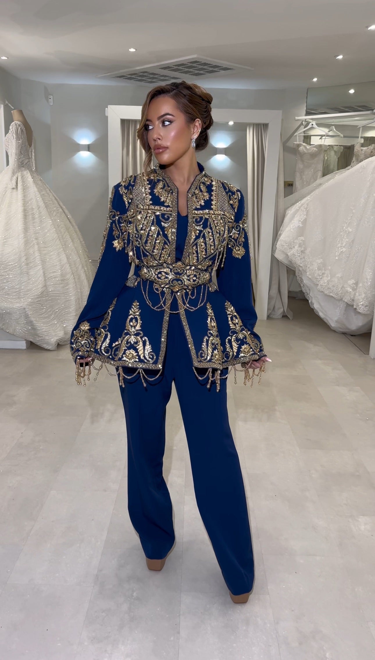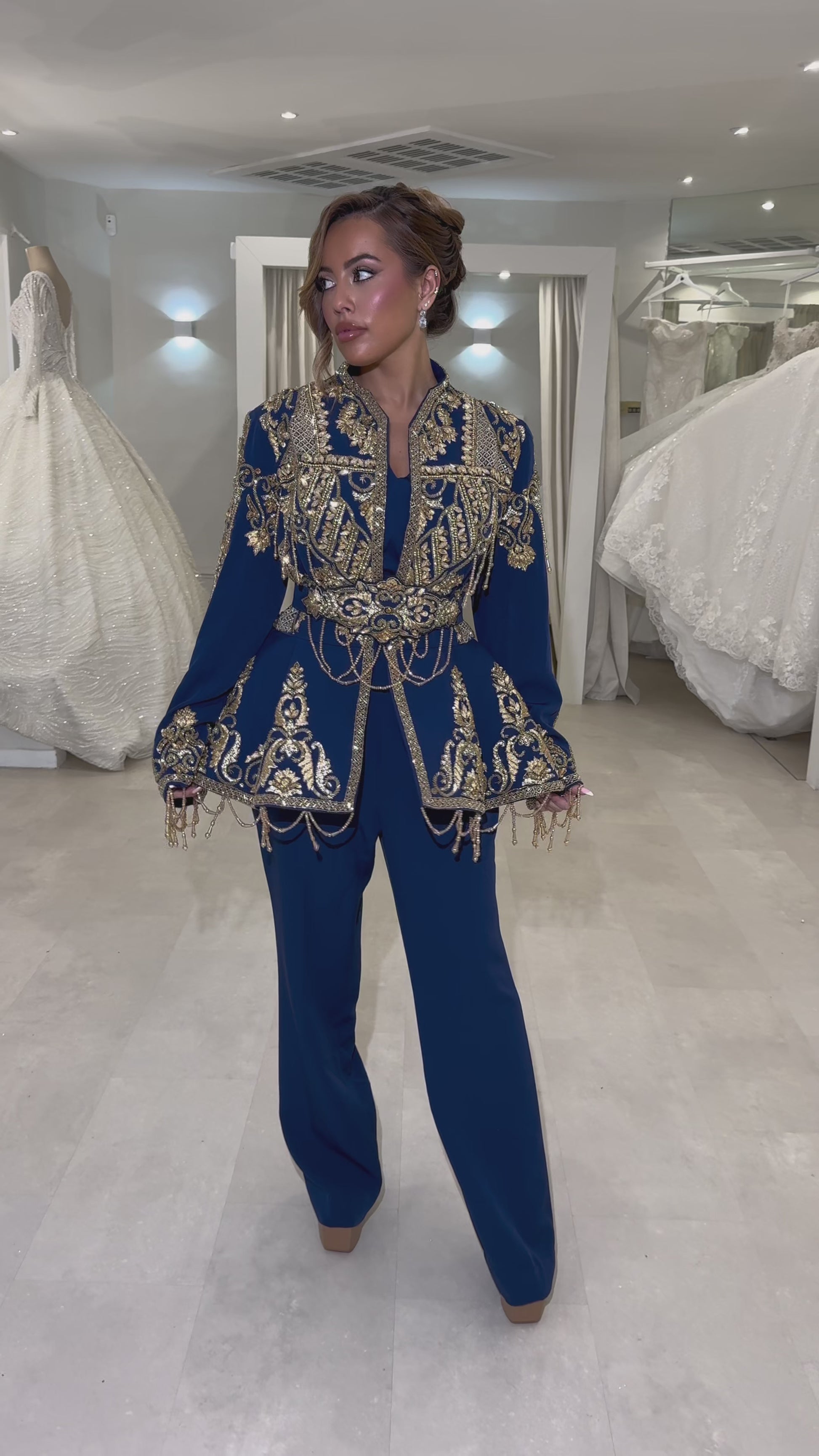 Cette combinaison bleu royal incarne l'élégance et le luxe avec un style unique. La pièce maîtresse est le haut, magnifiquement brodé de fils dorés, ornée de motifs baroques somptueux et de perles, créant un contraste saisissant avec la profondeur de la couleur. La coupe ajustée à la taille, associée à des manches longues, offre une silhouette structurée et sophistiquée.