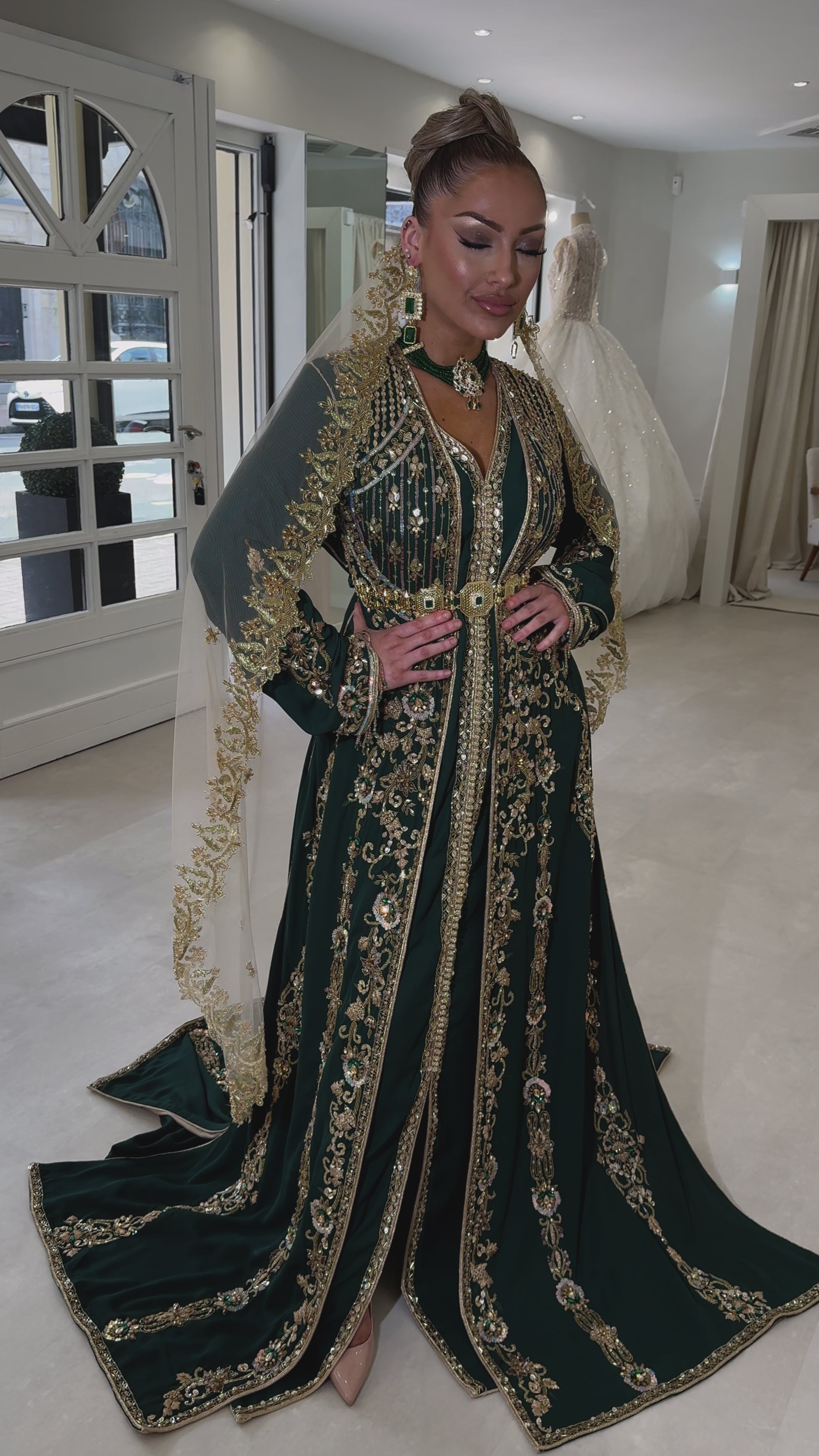 Smaragdgrüner Kaftan, opulente königliche Abende, goldener Stickerei-Kaftan, Edelstein-Kaftan, verzierter transparenter Schleier, raffinierte Eleganz-Kaftan, juwelenbesetzter Gürtel-Kaftan, moderner orientalischer Luxus, sublimierte traditionelle Kleidung, königlicher Grandeur-Kaftan