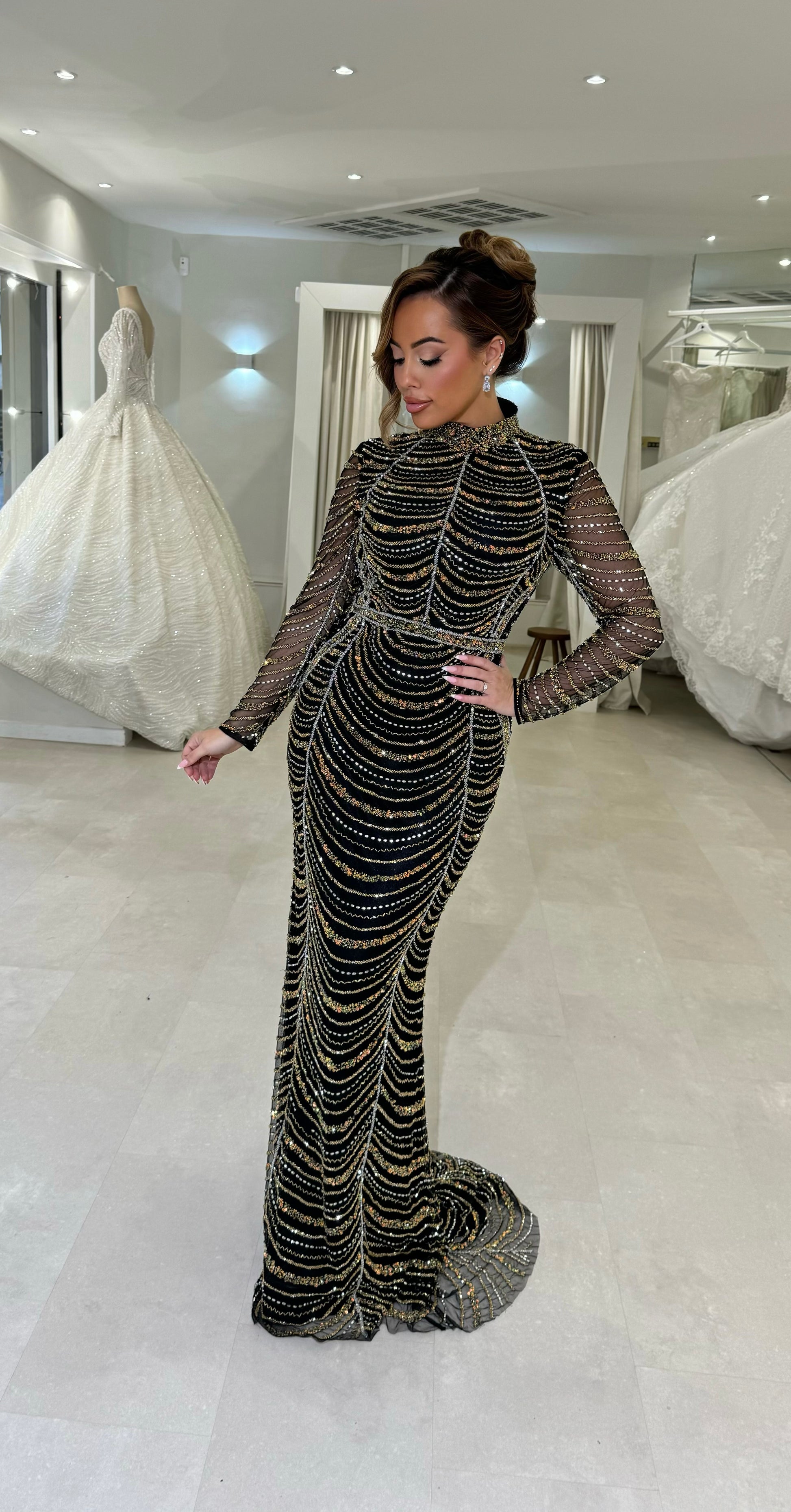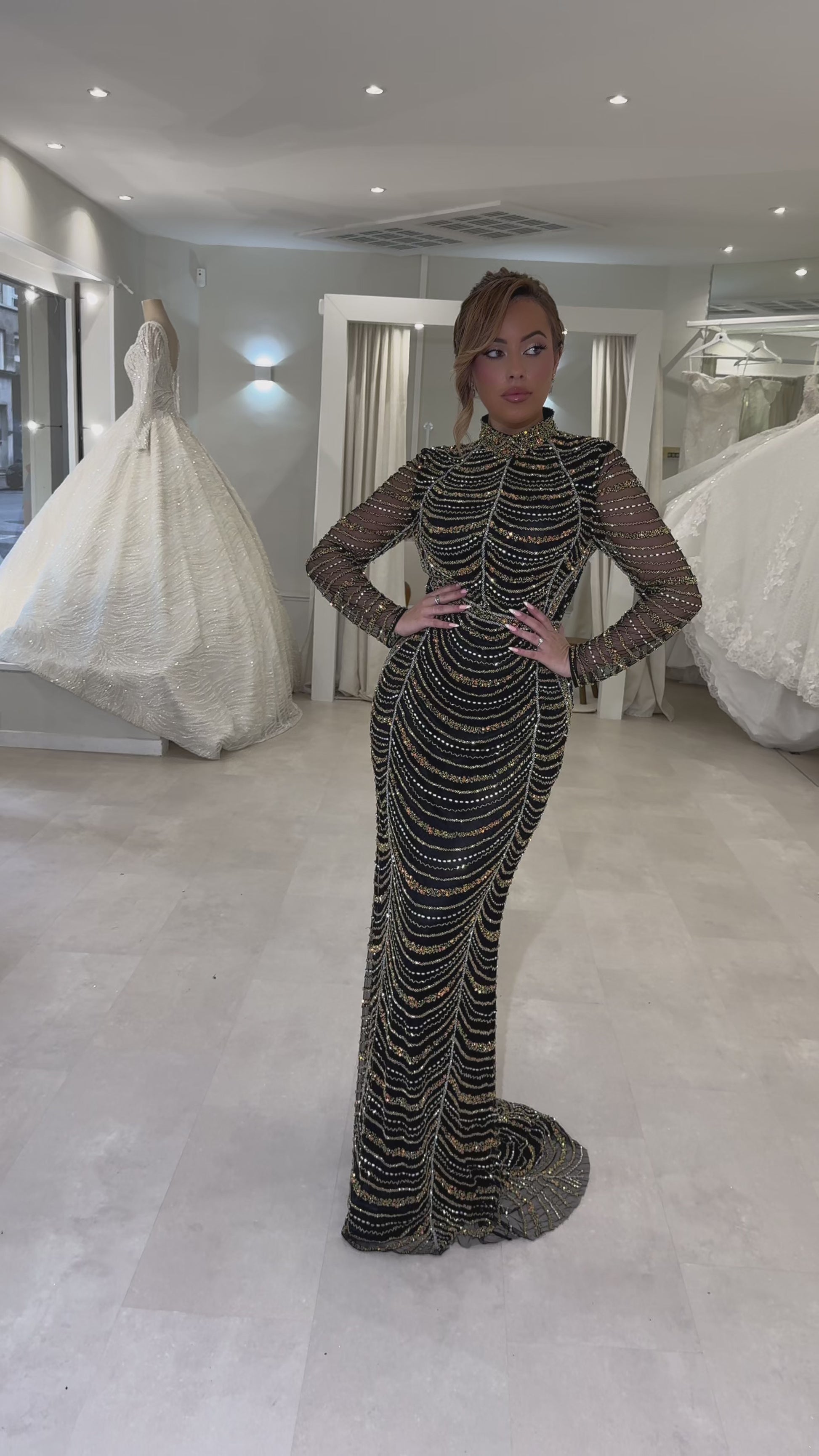 Cette somptueuse robe de soirée noire, ornée de pierres dorées étincelantes, est un véritable chef-d’œuvre de raffinement et d’élégance. Chaque ligne de pierres est minutieusement disposée en motifs festonnés, créant une allure fluide et captivante qui attire immédiatement le regard.